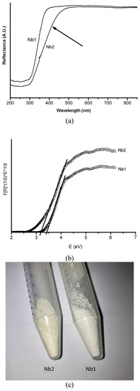 Figure 2a shows the DRS spectra of photocatalysts. The spectra of photocatalysts show a steep absorption edge in the UV-visible region, which is characteristic of a direct “valence band”–“conduction band” transition (VB → CB). According to the DRS spectra, the Nb1 sample reflects mainly in the UV region; however, the treatment of this photocatalyst with H2O2, which resulted in sample Nb2, led to the sensitization of the photocatalyst under the visible region (see the black arrow in Figure 2a). The Nb2 profile shows a decay in the reflectance in the visible range (320–500 nm); this can justify why Nb2 photocatalyst is yellow, whereas Nb1 is white (see Figure 2c). This color variation may be ascribed to the formation of defects such as neutral vacancies (that generate levels located within the forbidden band) and Nb4+ species (electrons being trapped by Nb5+ ions). Additionally, an intervalence transition (Nb5+ → Nb4+) should be observed, but it is probably masked by the strong VB → CB transition, which has already been explained [36,37].