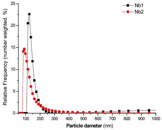 Figure 3 shows the particle size distribution of photocatalysts Nb1 and Nb2. According to this figure, a narrow distribution can be observed for both samples; most parts of the particles present in these photocatalysts are smaller than 250 nm. Sample Nb2 has particles smaller than particles of sample Nb1, which means that the treatment of Nb1 with H2O2 reduced the particle diameter size of the resultant material. This can also be related to the surface area of the materials, which, according to the adsorption–desorption of N2 measurements, were 14 m2·g−1 (Nb1) and 22.8 m2·g−1 (Nb2), confirming that the smaller particle diameter size led to the larger surface area.