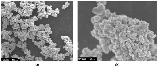 Figure 4 shows the SEM image obtained for Nb1(Figure 4a) and Nb2 (Figure 4b) photocatalysts. According to this figure, the samples present a non-regular morphology; most of the material is formed by agglomerated particles of a circular shape. There was not any difference between the morphologies of Nb1 and Nb2.