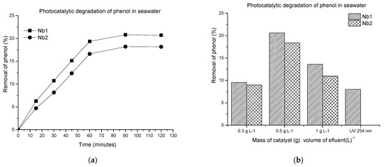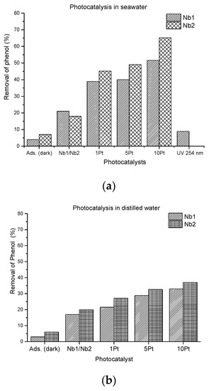 Figure 6a,b show the removal % of phenol under different conditions: in seawater (Figure 6a) and in distilled water (Figure 6b). In Figure 6a, it can be observed that the salts present in seawater did not interfere significantly in the photocatalytic processes occurring for Nb1 and Nb2 (the % of removal is similar in both situations: distilled and seawater, see Figure 6b). The effect of seawater salts will be discussed in the following paragraphs below.