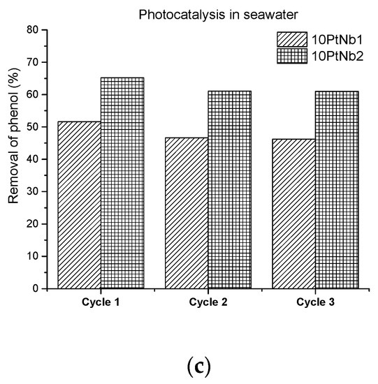 In the case of heterogeneous photocatalysis under seawater conditions, the seawater salts may be acting as additional hole scavengers for Pt°-promoted Nb catalysts. This effect may have led to an increase in the photooxidation of phenol in seawater in Pt°-promoted Nb. According to Hippargi et al. [40], a hole scavenger is a chemical species that can remove or deactivate unwanted impurities of the photocatalyst to ensure that they do not cause unfavorable reactions. The results of Figure 6a indicate that the seawater salts acted as a hole scavenger facilitating the oxidation of phenol. This hypothesis is supported by the fact that, in the presence of seawater salts, the performances of both Pt°-promoted Nb catalysts were better than the performances observed in distilled water (see Figure 6b).