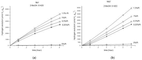 Moreover, the benefits obtained by the addition of the Pt° promoter can be attributed to its noble metal property, as its Fermi level is highly electronegative and can be shifted to negative potentials owing to charge-accumulating effects that favor the photocatalytic efficiency of photocatalysts [46]. Additionally, as reported by Lin et al. [47], Pt° particles act as a sink for photoinduced carriers, thus promoting the interfacial charge transfer process; all these effects can explain the high activity of Pt-promoted Nb1 and Nb2.