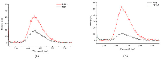 According to Figure 8b, the addition of the Pt° promoter makes the intensity of the peak at 425 nm of the spectrum of 2-HTA of Nb1 grow twice; in the case of Nb2, the presence of the Pt° promoter makes the intensity of the peak at 425 nm grow four times.