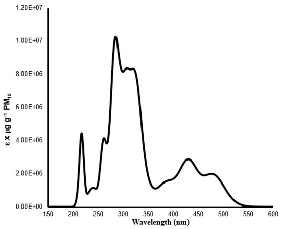 There are some relevant differences regarding the BP86-derived absorption spectrum obtained previously by us for PM2.5-derived PAHs over Porto [33,37]. One of them is that the spectrum obtained previously was only composed of four peaks (~240, ~280, ~330, and ~420 nm) and one tail (~470 nm) instead of the nine peaks of variable relative intensity observed in Figure 1. Furthermore, the more intense peak found before was present in the UVA region, instead of the UVB one. These differences can be attributed to the different chemical compositions and respective amounts of the groups of particulate matter. That is, for the PM2.5 samples collected over Porto, 55 PAHs were identified and quantified [36]. As for the PM10 samples, only 19 PAHs were detected [38]. Nevertheless, in general, some similarities can also be found, as both spectra (Figure 1 and in [34]) have more intense absorption in the UVB/UVA regions, followed by more moderate absorption in the UVC region and weaker absorption in the visible region. Thus, irrespective of possible differences in chemical composition, the absorption spectra associated with PAHs found in different groupings of particulate matter should present qualitatively similar shapes.