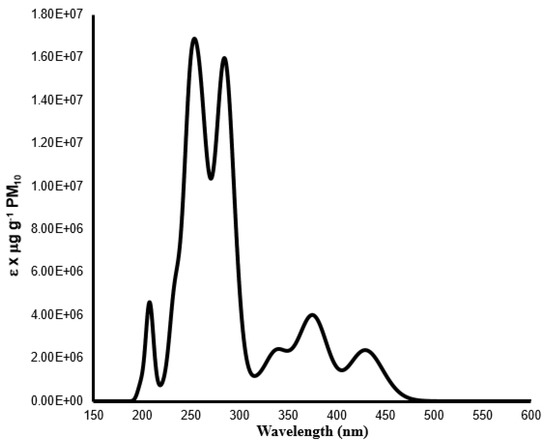 This study started with the analysis of the combined absorption spectra of the PAHs found over the city of Porto, within PM10 particles, when calculated with the BP86 functional and corrected for their experimentally determined amount [38]. These amounts are the average quantities found for each PAH in the sampling campaign performed by Alves et al. [38]. Using the same density functional (BP86) used in our previous evaluation of the absorption spectra of PAHs over Porto [34], in which PM2.5 particulate-related data was used [37], should enable comparisons that help us to understand if there are relevant differences in terms of light absorption from chemical components of different particulate matter. The BP86-derived combined absorption spectrum can be found in Figure 1. It should be noted that both in Figure 1 and Figure 2, absorption becomes zero below 200 nm. This should not be taken as an indication that the absorption of PAHs is really zero at those wavelengths, which is not the case. Those absorption intensities result simply from our choice of calculating 10 excited states for each molecule, which account for light absorption in the relevant UV–visible range.