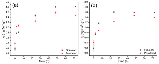Adsorption curve of metallic ions by granular and powdered biomass: (a) Zn2+; (b) Cu2+.