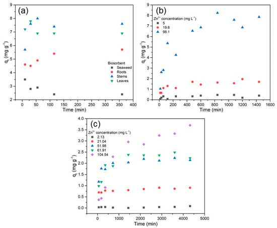 Adsorption curves of the Zn2+ ion for the systems: (a) S1-Zn—with different biosorbents [49]; (b) S2-Zn—with different initial concentrations of zinc [50]; (c) S3-Zn—with different initial concentrations of zinc [31].