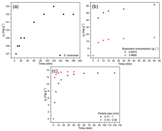 Adsorption curve of the Cu2+ ion for the systems: (a) S1-Cu—with Saccharomyces cerevisiae [51]; (b) S2-Cu—with different concentrations of biosorbent [52]; and (c) S3-Cu—with different biomass particle sizes [53].