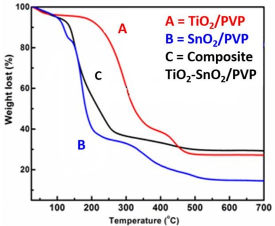 The TGA analysis are presented in Figure 2, helps to identify the polymer decomposition temperature. The TGA results demonstrate that the TiO2/PVP nanofibers and the SnO2/PVP nanofibers reached a degradation temperature of 500 °C and continue to saturate with the left-over materials of 29 and 18%, respectively. On the other hand, the composite TiO2-SnO2/PVP composite nanofibers reached a degradation temperature around 300–450 °C and continued to saturate with ample leftover sample of 39% to attain pure composite TiO2-SnO2 fibers. The comparison of these results assures the calcination temperature for these synthesized materials are beyond 500 °C and hence a temperature of 575 °C was chosen.