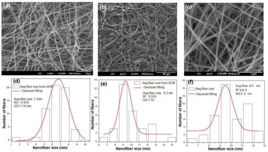 The SEM images of the electrospun nanofibers including TiO2 nanofibers, SnO2 nanofibers, and the composite TiO2-SnO2 nanofibers before calcination were smoother, bead-free, and uniform throughout their lengths, which is mainly attributed to the viscosity of the polymer [,]. The SEM images after calcination are presented in Figure 3 in which the polymer (PVP) was removed and the fibers of pure metal oxides TiO2 (see Figure 3a), SnO2 (see Figure 3b), and composite TiO2-SnO2 fibers (see Figure 3c) were found. Comparing the morphology of the three electrospun nanofibers, it can be noted that the pure TiO2 and the composite TiO2-SnO2 materials were in fiber form and the SnO2 showed both the fibrous morphology and tube-like structure. The transformation of morphology of SnO2 nanofibers after doping with TiO2 to form the composite TiO2-SnO2, changes to fiber again and the possible mechanism for the transformation in the morphology is discussed in one of our previous studies []. While calcinating a composite TiO2-SnO2 the crystallization/dissolution could cause a mechanical stress leading to wrapping which inherently transforms a fiber to a nanofibers shape. The transformation of nanofibers to fiber shape is associated with asymmetrical stress during the thermal treatment, where the excess surface energy results in wrapping or scrolling []. This could be the reason for the transformation of the composite TiO2-SnO2 materials to fiber form after doping with TiO2 (see Figure 3c). The average nanofiber diameters (standard deviation values are given as plus or minus) of the as-spun TiO2, SnO2, and TiO2-SnO2 composite fibers were 7.3 ±1.16 nm, 9.3 ± 1.70 nm, and 9.5 ± 2.4 nm, respectively (Figure 3d–f).