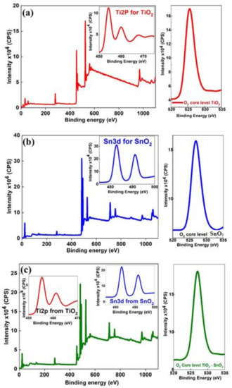 (a) XPS survey spectra for TiO2, Ti2p bands, and O2 core levels of TiO2; (b) XPS survey spectra of SnO2, Sn 3d bands, and O2 core levels of SnO2; (c) XPS survey spectra of composite TiO2-SnO2, Ti2p, and Sn3d as composite TiO2-SnO2 fibers and O2 core levels composite TiO2-SnO2.