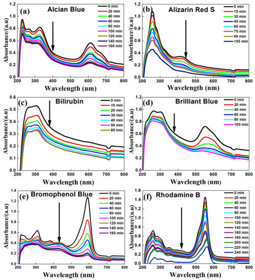 In this study, UV light-assisted (Wavelength ~390 nm) photocatalytic studies were performed on the compositeTiO2-SnO2 nanofibers for different dyes such as Alcian Blue, Alizarin Red S, Bilirubin, Brilliant Blue, Bromophenol Blue, and Rhodamine B ITC. The maximum absorbance of wavelength for corresponding dyes with respect to time was measured and plotted as shown in Figure 5. The spectrum of Alcian Blue, Alizarin Red S, Bilirubin, Brilliant Blue, Bromophenol Blue, Rhodamine B ITC in the UV–Vis region exhibit main bands at 327.7, 420.4, 309.1, 307.8, 310.2, and 349.3 nm, respectively. The absorption values are related to a specific dye in which a decrease in absorption intensity was observed, which is indicative of degradation of the dyes. It was also noticed that the nitrogen double bond (–N=N–) of the azo dyes are the most active sites for degradation of the dyes. This implies that the complete degradation of the dyes (Figure 5a–f) was observed before 3 h (except the Rhodamine B, which was subjected to 4 h of degradation in an optimized condition).