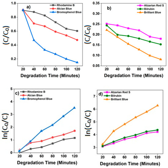 (a,b) The rate of the reaction for Alcian Blue, Alizarin Red S, Bilirubin, Brilliant Blue, Bromophenol Blue, and Rhodamine B; (c,d) rate constant evaluation from the linear fitting using equation k = −2.303 × log(C0/C).