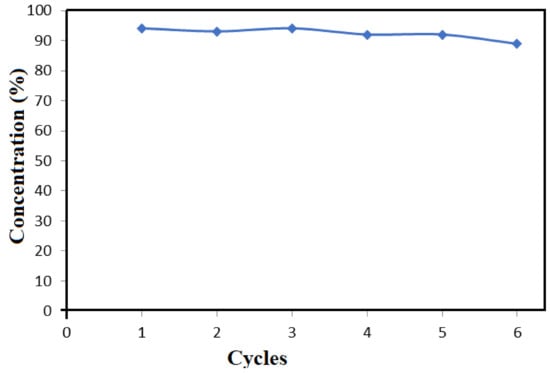 Figure 7 shows results of the reusability tests for the TiO2-SnO2 composite in the photocatalytic extraction of Brilliant blue dye. As it can be seen from the figure, a high degree of dye removal (94–89%) is observed by the chosen photocatalyst during six cycles wherein reusability slightly decreases by the end of the sixth cycle. The obtained results indicate that good stability and reusability of the tested photocatalyst can be achieved.