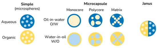 Encapsulation is an important process for the food, pharmaceutics, cosmetics, and other industry domains, in which an active ingredient is immobilized inside a polymeric shell to protect it from the external environment and to control its release [1,2,3]. The polymeric shell and active ingredient form the polymer microparticle can be (i) a microsphere, where the active ingredient is integrated within the polymeric matrix, (ii) a microcapsule with a core–shell morphology, or (iii) Janus microparticles, which are spheres constructed of two halves—one hydrophobic and the other hydrophilic—with different active ingredients encapsulated in each half (Figure 1). The production of polymer microparticles can be performed through a chemical process such as suspension polymerization [4] and coacervation [5], or a physical process such as atomization (spray drying [6,7] and spray chilling [8]), extrusion [9], and microfluidics [10,11,12]. Other processes, including fluidized bed coating [13] and pan coating [14], allow for the coating of solid particles and the formation of a microcapsule of a solid core. Each of the aforementioned processes has its advantages, drawbacks, and challenges to render them sustainable [15]. The latter may be evaluated according to environmental factors describing waste generation, energy consumption, and the nature and quantity of solvents employed in different experimental conditions and scales [16,17,18,19].