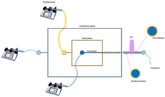 Microfluidics can be defined as an experimental downsizing approach that, on the one hand, allows for the better control of fluid behavior inside microchannels for sustainable chemistry, biotechnology, and process engineering. On the other hand, it may be seen as a microminiaturized production technology containing inlets, outlets, and tunnels, through which a fluid flow is confined and physically or chemically treated [23]. The production of polymer microparticles (microspheres and microcapsules) using microfluidics can be seen as a microminiaturized process, allowing for the control of size, morphology, and composition in the fabrication of polymer microparticles [20]. Microspheres are spherical polymer microparticles, in which an active ingredient is inaugurated within the matrix of the shell. To synthesize them, a dispersed phase liquid and an immiscible continuous phase liquid are pumped with an external device such as a pressure regulator system, peristaltic pump, or syringe pump into a microfluidic chip, where they meet at an intersection (Figure 2). The continuous liquid segments the dispersed one at the intersection forming monodisperse droplets either in a dripping or jetting regime. The second step of the process is droplet solidification either through a physical process (evaporation or dissolution) if the droplet is a mixture of a polymer, solvent, and active ingredient (polymer solution mixture) [11] or a chemical reaction (polymerization or crosslinking) if the droplet is a mixture of a monomer(s), initiator, and active ingredient to be encapsulated (monomer mixture). The monomer mixture droplet may be solidified using UV- or thermal-induced polymerization [24,25] either (i) in situ, along the trajectory of the droplets inside the chip (Figure 2a), or (ii) off-chip, where droplets are collected in a flask and then polymerized in batches (Figure 2b). On the other hand, polymer solution droplets are solidified through solvent removal using evaporation or dissolution, in situ or off-chip [10,11]. Microcapsules are polymer microparticles composed of an active ingredient core isolated inside a polymeric shell that can also be produced using microfluidics through a two-step procedure, including (i) the formation of multiple emulsions of core–shell geometries and (ii) shell solidification, depending on the nature of the shell, as shown in Figure 3.