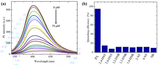 (a) Fluorescence quenching measurements of BSA@CuNCs with PA concentrations in the range of 0–75 μM. (b) The response of quenching of BSA@CuNCs in the presence of other nitroaromatic compounds.