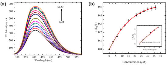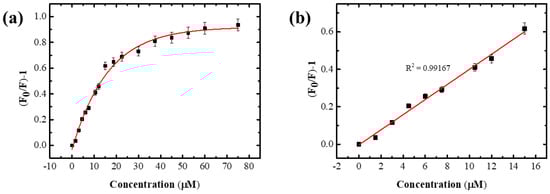 (a) The plot of the (F0/F)-1 vs. the concentration of PA in the range of 0–75 µM. (b) The linear plot of (F0/F)-1 vs. the concentration of PA in the range of 0–15 µM.