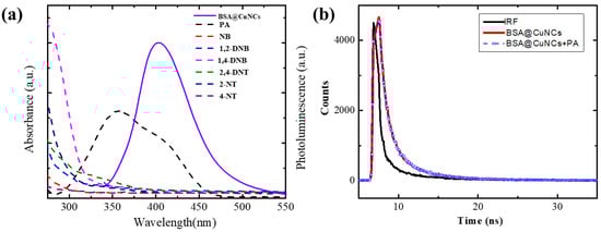 (a) UV-Vis spectra of PA (black dashed line) and other nitroaromatic compounds (dashed lines) and fluorescence spectra (solid line) of BSA@CuNCs (b) Time-resolved fluorescence decay curves of BSA@CuNCs in the absence and presence of PA.