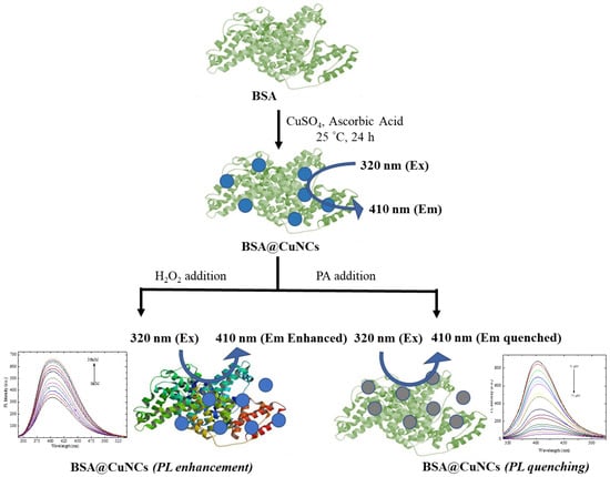 Schematic diagram for the fabrication procedure of BSA@CuNCs and its applicability for the sensing of PA/H2O2.