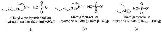 Ionic liquids used in this study: (a) 1-butyl-3-methylimidazolium hydrogen sulfate ([C4mim][HSO4]); (b) methylimidazolium hydrogen sulfate ([Hmim][HSO4]); and (c) triethylammonium hydrogen sulfate ([HN222][HSO4]).