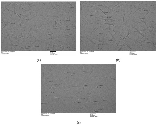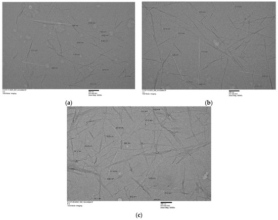 The dimensional parameters of the ChNWs processed using each IL were obtained from TEM. A 10-times dilution of the original suspensions, obtained after ultrasonication, with a concentration of ~0.1 mg mL−1 was the most suitable for TEM imaging. As shown in the TEM images (Figure 2), the morphology of the nanowhiskers was highly regular. The ChNWs from [Hmim][HSO4] and [HN222][HSO4] presented elongated crystalline rod-like nanoparticles, characterized by pointed ends, with diameters ranging between 20 and 22 nm, and lengths ranging between 230 and 246 nm (Table 1). Given the obtained results, we estimated the average aspect ratio (L/d) to be ~12 to 12.5. These findings correlate with those previously reported when using [C4mim][HSO4] for hydrolysis, with diameters of 21.7 ± 5.5 nm and lengths of 216 ± 78 nm. Overall, the ChNWs obtained showed a similar length and diameter, i.e., avg. 230 ± 12 nm and 21.3 ± 0.9 nm, respectively. For comparison, the aspect ratio of ChNWs obtained through hydrolysis with HCl can range from 15 to 120, depending on the chitin source used [73]. The size of ChNWs is directly dependent on the biomass it was isolated from. For example, the hydrolysis of α-chitin from shrimp shells using 3 N HCl results in nanowhiskers with an average length and width of 216 ± 91 nm and 16.4 ± 5.8 nm [74]. When chitin is sourced from Riftia tubes, the resulting ChNWs have a length range from 500 nm to a few µm [75]. The size of the nanowhiskers from Oyster and Button mushrooms ranging from 50 to 200 nm in length and ~11 nm in diameter [76].