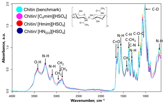 ATR FTIR spectra (4000–650 cm−1) of chitin (aqua) and chitin nanowhiskers (ChNWs): ChNWs/Ch/[Hmim][HSO4] (red), ChNWs/Ch/[HN222][HSO4] (blue), and ChNWs/Ch/[Hmim][HSO4] (pink).
