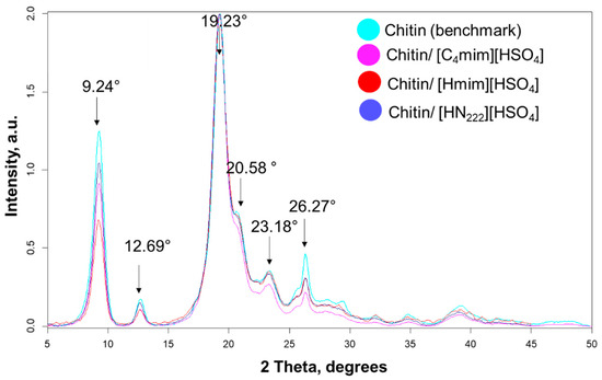 Powder X-ray diffraction (pXRD) was used to elucidate the degree of crystallinity of all products (Figure 4). For that, the diffractograms obtained for ChNW/Ch/ILs samples were compared with the diffractogram of pure chitin. In all diffractograms, the peaks were found at 9.24°, 12.69°, 19.23°, 20.58°, 23.18°, and 26.27°, corresponding to (0 2 0), (0 2 1), (1 1 0), (1 2 0), (1 3 0), and (0 1 3) reflections, respectively [78,79]. The crystallinity index (CrI) was determined using the peak height method based on a comparison of the intensity of a crystalline reflection 19.23° (I110) and the height of amorphous scattering (16°, Iam) [80,81]. However, the reliability of this method is based on the precision of background subtraction and the presence of both anhydrous and hydrated polymorphs [82]. Therefore, we have also employed the peak deconvolution method that typically provides higher accuracy [83,84]. This method is based on calculating the ratio between the area of crystalline peaks and the total area of a pXRD pattern. Figures S8–S13 and Tables S2–S7 (ESI) provide the calculated peak fitting of the diffraction profiles, the calculated peak locations, areas under the peak, and full width at half maximum (FWHM) values.
