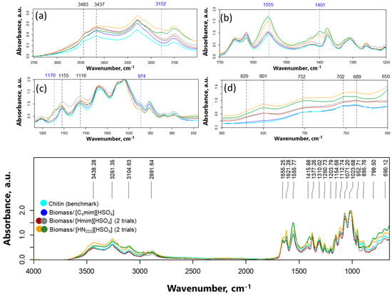 Upon examining the FTIR spectra (Figure 6) of the obtained ChNWs, it became evident that while the location and intensity of the peaks of ChNWs/SS/[C4mim][HSO4] closely resembled those of commercially available chitin [50,51], there were significant differences in the spectra of ChNWs/SS produced using “inexpensive” ILs, i.e., ChNWs/SS/[Hmim][HSO4] or ChNWs/SS/[HN222][HSO4]. The spectrum of ChNWs/SS/[Hmim][HSO4] exhibited peaks typical for chitin; however, the intensities of many peaks were found to be somewhat greater than those typically associated with the biopolymer. This was particularly true for weak vibrations at 3483 and 3437 cm−1, normally associated with water molecules, weak peaks in the region 820–650 cm−1, and medium/strong vibrations at 1155 and 1116 cm−1, characteristic of sulfate ion [87,88,89]. The FTIR spectrum of ChNWs/SS/[HN222][HSO4] also showed peaks of enhanced intensities similar to the ones described for ChNWs/SS/[Hmim][HSO4]. In this sample, additional peaks at 3152, 1555, 1401, 1170, and 974 cm−1 were identified, which did not match either chitin or sulfate (indicated in Figure 6a–d in blue color). The peaks did not belong to ionic liquids (Figure S7). We suggest that the reader consult the SI file, where the expansion of the FTIR regions is provided. Byproduct formation was reproducible in both cases.