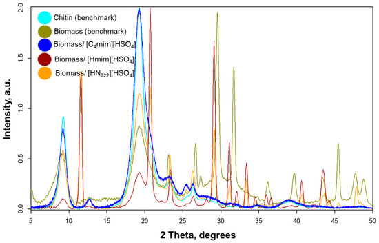 Powder X-ray diffractograms (Figure 7) of ChNWs/SS/[Hmim][HSO4] and ChNWs/SS/[HN222][HSO4] confirmed the presence of chitin (at 9.24°, 12.69°, 19.23°, 20.58°, 23.18°, and 26.27°, respectively [78,79]), but also peaks that did not belong to the biopolymer, at 11.56, 20.68, 23.33, and 29.07° 2θ. The amount of chitin was significantly greater in ChNWs/SS/[HN222][HSO4], whereas ChNWs/SS/[Hmim][HSO4] showed a significant amount of byproduct. Interestingly, no byproduct formation was detected in ChNWs/SS/[C4mim][HSO4]. It is also worth noting that the same byproduct was formed regardless of the “inexpensive” IL’s identity, excluding any compound that could be derived from the ILs themselves. Also important is that the byproduct formed only in the case of IL reactions with biomass but was not seen when pure chitin polymer was hydrolyzed using these ILs, despite identical reaction conditions. This suggests that the formation of the byproduct had something to do with minerals present in biomass.