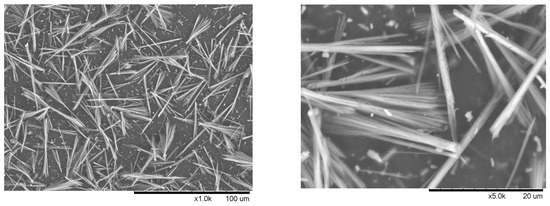 Since one of the goals of this work was to generate high-purity chitin, identifying the new material was of great importance. An analysis of the literature identified the peaks at 11.56, 20.68, 23.33, and 29.07° 2θ as calcium sulfate dihydrate (also known as gypsum, Ca(SO4)·2H2O) [90]. TEM images did not show the presence of gypsum, likely because of the mineral being dissolved in water during the preparation of the sample for TEM analysis. On the other hand, lyophilized samples were expected to contain both chitin nanocrystals and gypsum after water removal. When the ChNWs/SS/[HN222][HSO4] lyophilized sample was dispersed in a small amount of water and placed onto a carbon tape, followed by slow water evaporation, Scanning Electron Microscopy (SEM) imaging revealed the presence of gypsum crystals (Figure 8).