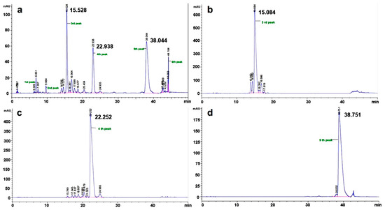 HPLC analysis of (a) crude, (b) triene, (c) diene, (d) monoene.