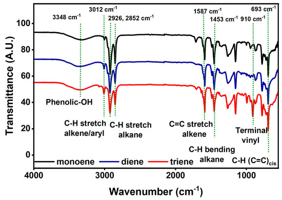 Stacked FTIR spectra of monoene, diene, and triene cardanol.