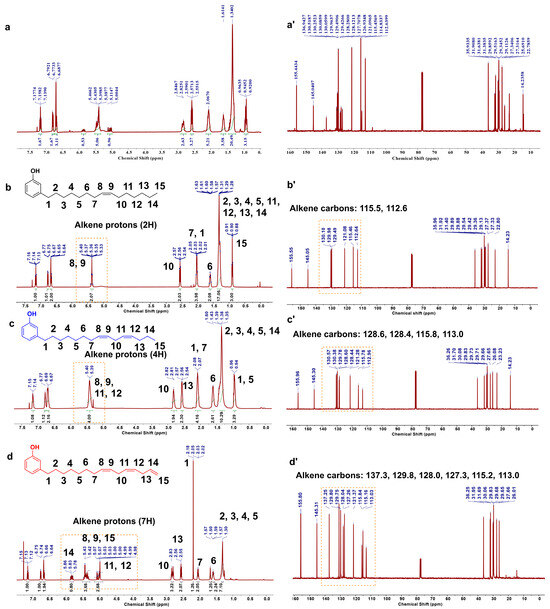 1H and 13C NMRs of crude (a,a’), monoene (b,b’), diene (c,c’), and triene (d,d’) cardanol. Recorded in CDCl3 (δ = 7.25 ppm for 1H NMR and 77.5 ppm for 13C NMR). Monoene, diene and triene of cardanol were distinguished by the characteristic signals of alkenes which are presented in the yellow box.