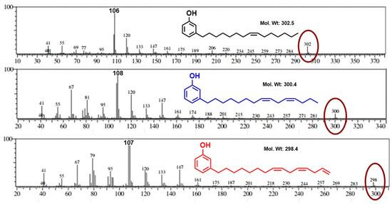 GC–MS plots of cardanol monoene, diene, and triene. Red circles represent the desired molecular weight for individual fractions of cardanol confirming the purity of sample.
