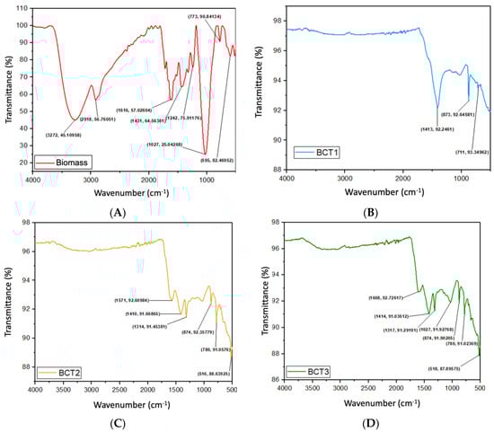 3.4. Biomass and Bioadsorbents Structural Characterization (FTIR)