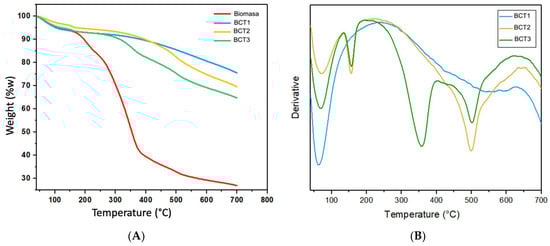 3.5.1. Thermogravimetric Analysis (TGA) of Biomass and Bioadsorbents