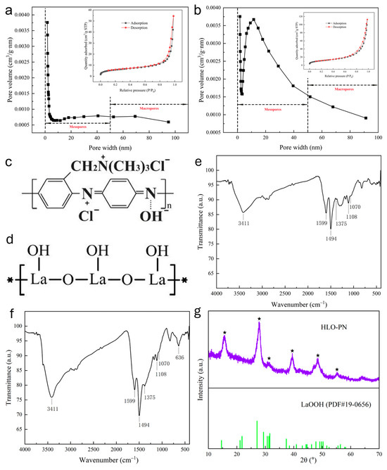 Pore diameter distributions and corresponding N2 adsorption–desorption isotherms (inset) of (a) PN and (b) HLO-PN; structural formula for (c) PN and (d) LaOOH; FTIR spectra of (e) PN and (f) HLO-PN; XRD patterns of (g) HLO-PN. (*: Hydrated Lanthanum Oxide).