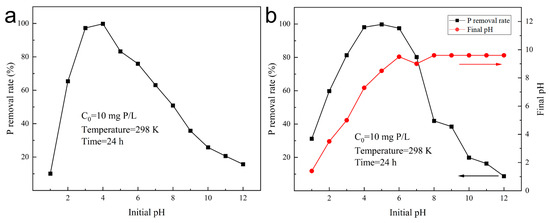 The pH dependence of phosphate adsorption by PN and HLO-PN was studied in the pH range of 1–12. Detailed experimental conditions: The initial phosphorus concentration was 10 mg/L, the initial pH was 5.8, and the reaction was adjusted by using 0.1 M HCl and 0.1 M NaOH solutions at 298 K for 24 h, with the dosages of PN and HLO-PN being 4 g/L and 1.5 g/L, respectively. As shown in Figure 3a, the removal efficiency of phosphate by PN firstly increased from 10.1% to 99.8% and then decreased to 15.7%. The highest removal rate was observed at pH 4. As shown in Figure 3b, the removal rate of phosphate by HLO-PN increased from 31.2% to 99.8% and then decreased to 8.7% in the range of pH 3.0~12.0, and showed an excellent removal rate (>83.3%) in the range of pH 3.0~5.0. The highest removal rate was observed at pH 5. Excellent removal (>80.2%) was shown in the pH range of 3.0–7.0. The gradual increase in the pH of the final solution after the adsorption of phosphate indicates that the application of HLO-PN adsorption of phosphate improves the alkalinity of the solution and helps to solve the problem of acidity in water.
