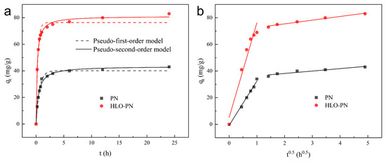 To explore the adsorption behavior of PN and HLO-PN on phosphate, phosphate removal kinetic studies were carried out. As shown in Figure 4a, the phosphate removal by adsorption increased dramatically in the first 1 h. The adsorption of PN and HLO-PN was 79.07% and 83.13% of the final adsorption, respectively. Over time, the adsorbent became saturated and the number of active sites decreased. The adsorption capacity of PN and HLO-PN increased slowly and tended to be balanced at about 6 h. The adsorption capacity of PN and HLO-PN was 93.02% and 92.77% of the final adsorption capacity, respectively. To quantitatively describe the adsorption of phosphate on PN and HLO-PN, kinetic data were fitted using three well-known kinetic models, quasi-primary, quasi-secondary and intraparticle diffusion models. As shown in Table S2, the quasi-secondary kinetic model fitted the experimental data with high R2 values (0.9902 for PN and 0.9962 for HLO-PN), indicating the chemisorption characteristics of phosphate on PN and HLO-PN. It is noteworthy that the quasi-secondary kinetic constant K2 (0.067) for HLO-PN is larger than that of K2 (0.054) for PN, indicating that the adsorption rate of phosphate by HLO-PN is faster than that of PN [29].