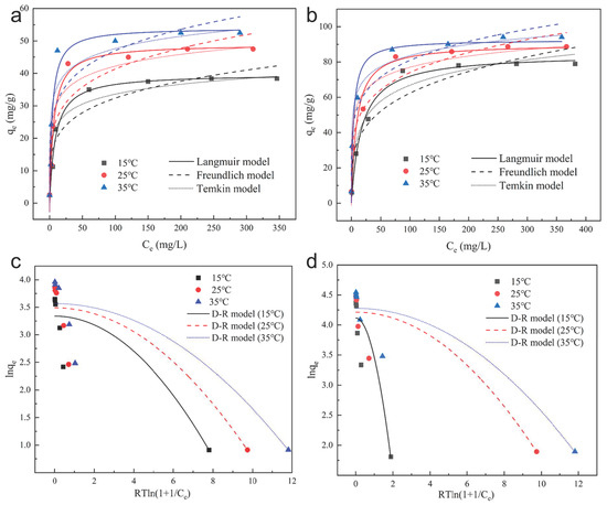 (a) PN’s fitting of Langmuir, Freundlich and Temkin isotopes. Freundlich and Temkin isotherm models for phosphate; (b) HLO-PN’s fitting of Langmuir, Freundlich and Temkin isotherm models for phosphate; (c) PN’s fitting of D-R isotherm models for phosphate; (d) HLO-PN’s fitting of D-R isotherm models for phosphate (C0 = 10–500 mg/L, pH 5.0, PN dosage 4.0 g/L, HLO-PN dosage 1.5 g/L, contact time 24 h).
