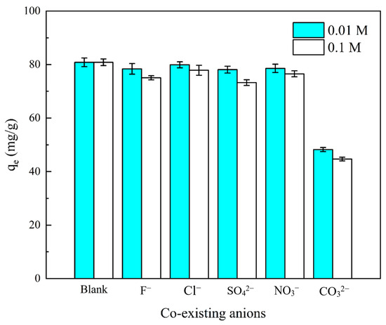Figure 6 shows the effect of the coexisting anions , , , and on the phosphate adsorption capacity of HLO-PN. The phosphate adsorption capacity (qe) of HLO-PN was 80.85 mg/g without any addition of competing anions. When the coexisting anion concentration of , , and was 0.01 M, HLO-PN’s qe was barely impacted, suggesting that it has a strong ability to selectively adsorb phosphate anions. When the coexisting anion concentration of , , and increased to 0.10 M, the qe only slightly decreased, indicating that this competing anion hardly interferes with the strong adsorption of phosphate on HLO-PN in the presence of higher concentrations. In the presence of 0.01 and 0.1 M , the adsorption capacity of phosphate on HLO-PN was 48.23 and 44.71 mg/g, which decreased by 40.35% and 44.70%, respectively. This is because the Ksp value of La2(CO3)3 (3.98 × 10−34) is smaller than that of LaPO4 (3.7 × 10−23) [43], which is favorable for phosphate adsorption on HLO-PN via displacement, and the formed LaPO4 was subsequently converted to La2(CO3)3, thus reducing the phosphate adsorption capacity.