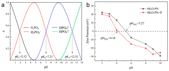 (a) Existence forms of phosphates in different environmental pH levels; (b) zeta potential of HLO-PN before and after phosphate adsorption.