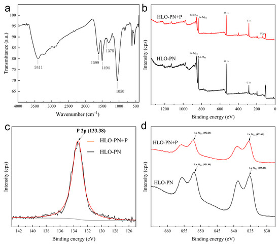 (a) FTIR spectra of HLO-PN after phosphate adsorption. (b) Total survey scans of XPS spectra of HLO-PN before and after phosphate adsorption. (c) High-resolution XPS spectra of P 2p for HLO-PN+P. (d) High-resolution XPS spectra of La 3d for HLO-PN+P.