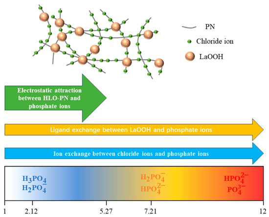 The form in which LaOOH exists changes in solutions of different pH. Under acidic conditions (low pH), LaOOH exists as La3+ (Equation (1)). As the pH increases, LaOOH gradually exists in the form of hydroxides such as and [45]. Specifically, at low pH of 1.0–3.0, two phosphates exist (i.e., H3PO4 and ); however, the adsorption of phosphate by HLO-PN is relatively low due to the predominant form of phosphate (H3PO4) and the leached form of La (La3+). However, when the pH varies from 3.0 to 5.0, becomes dominant and there is also positively charged HLO-PN (pH < pHPZC = 5.27). Therefore, the protonated and the negatively charged , a combination of electrostatic attraction (Equation (4)) and ligand exchange (Equation (5)), leads to an increase in phosphate removal.