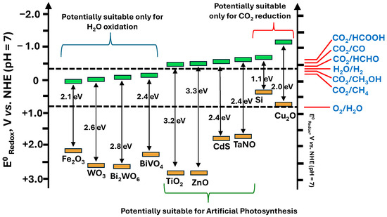Valence (VB) and conduction (CB) band-edge positions of some semiconductors relative to the energy levels of the redox couples involved in the reduction of CO2 and oxidation of H2O vs. NHE at pH = 7. Values for CBm and VBm obtained from Tamirat et al. [16].