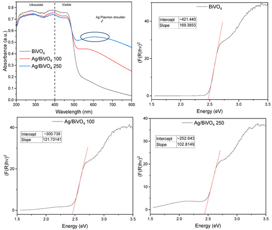 Each material absorbs strongly in the UV and visible regions of the electromagnetic spectrum. This was expected as the colour of the samples goes from a yellow to a dark green (see Table 1). This agrees with the literature [37]. Pure BiVO4 absorbs the least intensely out of the materials at longer wavelengths. However, upon the incorporation of Ag NPs onto the surface of the materials, the extent of visible light absorption increases greatly in the 800–500 nm (visible) region, with the Ag/BiVO4 250 sample absorbing more intensely than the 100 mA analogue. The spectra of the sputtered materials show an additional peak at ~600 nm (highlighted in the plot). This is due to the plasmonic absorption by Ag NPs [38]. This SPR band is attributed to longitudinal oscillation of electrons on the NP surface [39], i.e., a surface plasmon.