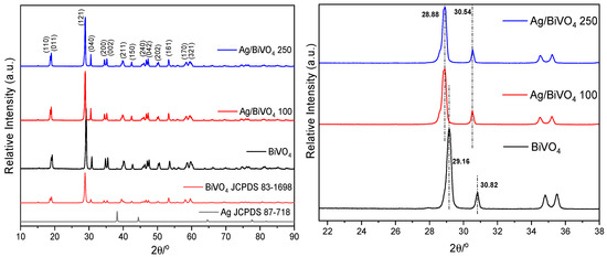 Powder X-ray diffraction (XRD) was carried out to confirm the crystalline phases of the materials by comparing their diffraction profiles to reference profiles. The diffractograms of BiVO4, the Ag-sputtered materials, and reference profiles of Ag0 and BiVO4 are displayed in Figure 3.