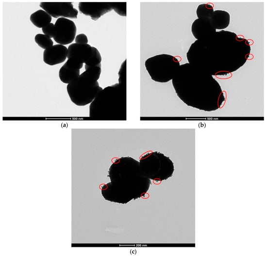 TEM micrographs of (a) BiVO4, (b) Ag/BiVO4 100, and (c) Ag/BiVO4 250, where the red circles highlight Ag NPs present on BiVO4 surfaces. Particle size distribution histograms can be found in the Supplementary Material (Figure S1).