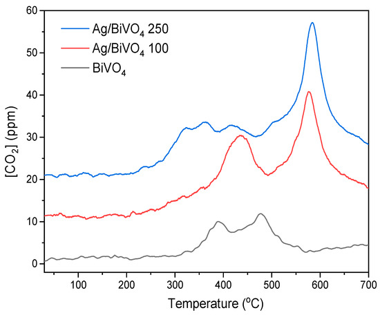 The shape of the TPD profiles from the composite materials differed greatly from the CO2 desorption profile from pure BiVO4, suggesting that the contribution of Ag to the adsorption/desorption process was significant. The addition of Ag led to the development of strong CO2 binding sites. This is evident as the two composite profiles exhibited large desorption peaks centred at approximately 585 °C. This peak was not present in the CO2 desorption profile from BiVO4. The area under this peak increases slightly as the loading of Ag in the composites increases, showing that the adsorption site is either on the Ag particles or at Ag/BiVO4 interfaces. Studies have shown that Ag NPs can adsorb CO2, especially when the Ag has been exposed to oxygen. The O atoms on the surface of Ag can interact with CO2(g) to form carbonate species [46,47,48]. As these materials were not stored in a protective or inert environment, it is probable that atmospheric oxygen had adsorbed on the surface of the materials, increasing their basicity and, in turn, their ability to adsorb CO2. However, as the proportion of silver on the surface of BiVO4 is low (<1%), the increase in the extents of CO2 adsorption between the samples is not large. Nevertheless, the trend is there.